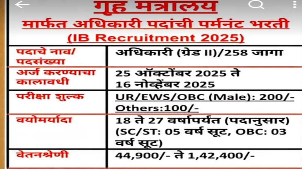 IB Recruitment 2025 : महाराष्ट्र सरकार कडून नोकरी भरती महाराष्ट्र सरकारच्या गृहमंत्री अंतर्गत मार्फत अधिकारी पदाचे प्रमाण नोकरी भरती निघाली तुम्हाला जर अर्ज करायचा असेल तर समोर संपूर्ण माहिती आलेली वेबसाईट सुद्धा